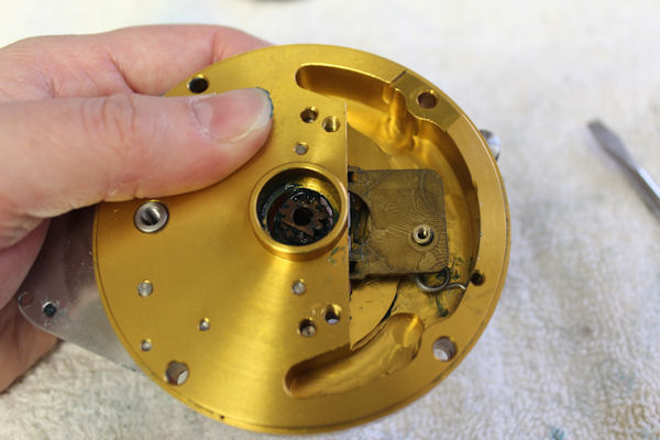 I'm not removing the clicker for this demonstration, as it is pretty simple to do so if needed. I will note that the #40 bearing assembly is unscrewed from the outside of the plate in.